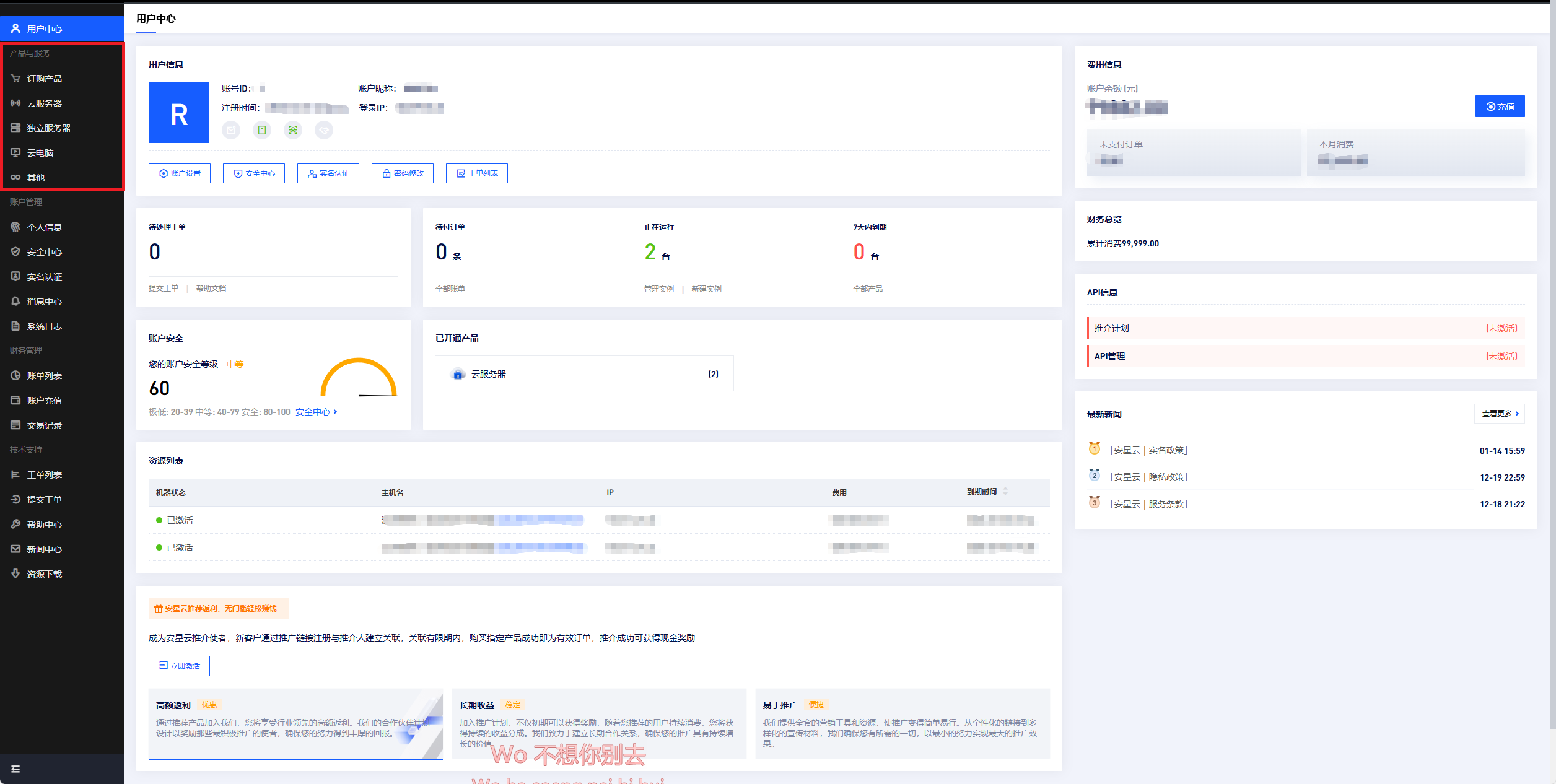 登录安星云控制台后,您可以在左侧导航栏进入 「产品与服务」->「云服务器」 页面。此页面是您管理云服务器实例的核心中枢。(其他类型产品可能在其他类目)