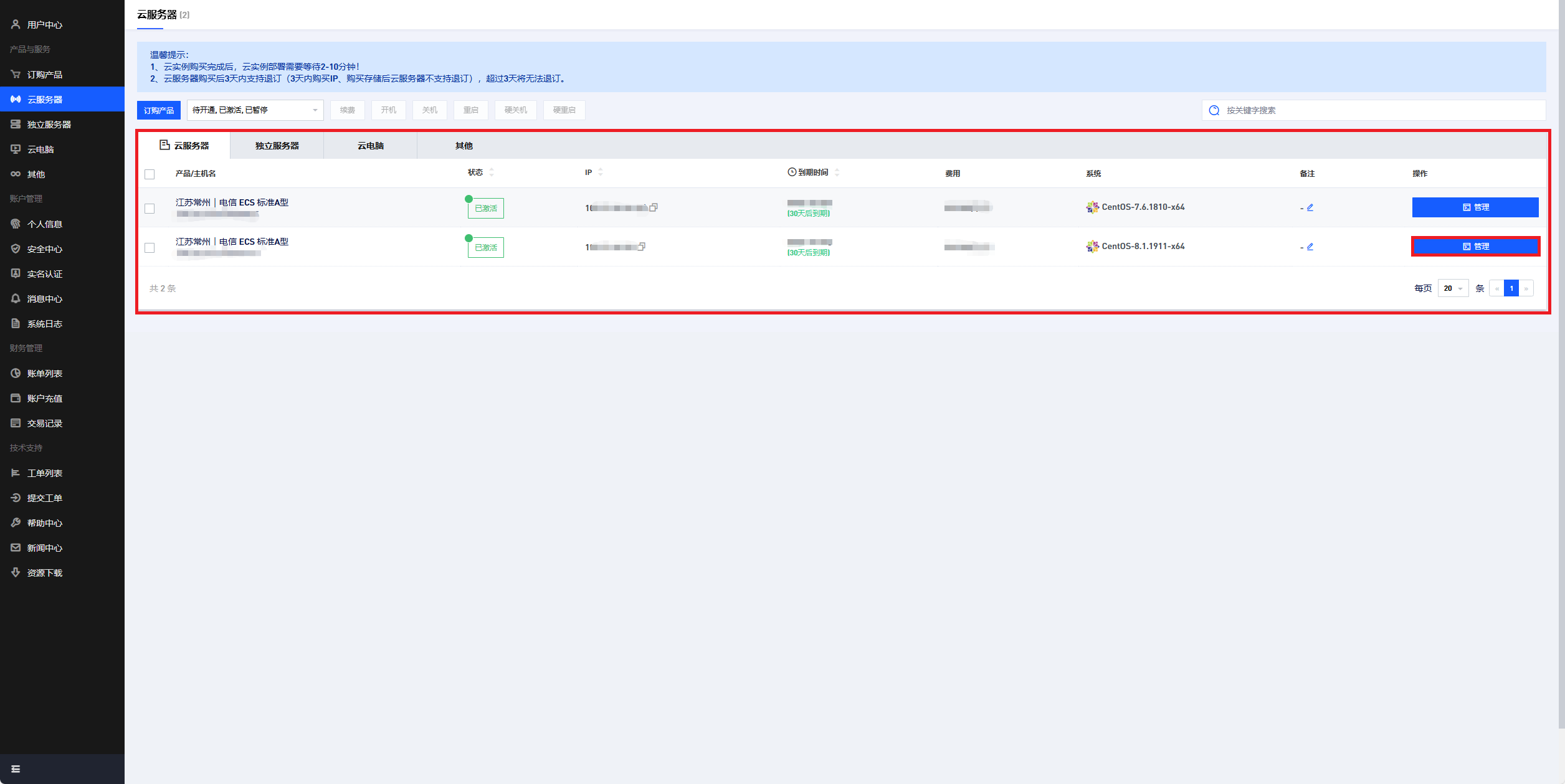 - 全局视图:集中展示您名下所有云服务器的关键状态,包括运行状态、IP地址、到期时间、配置及费用。