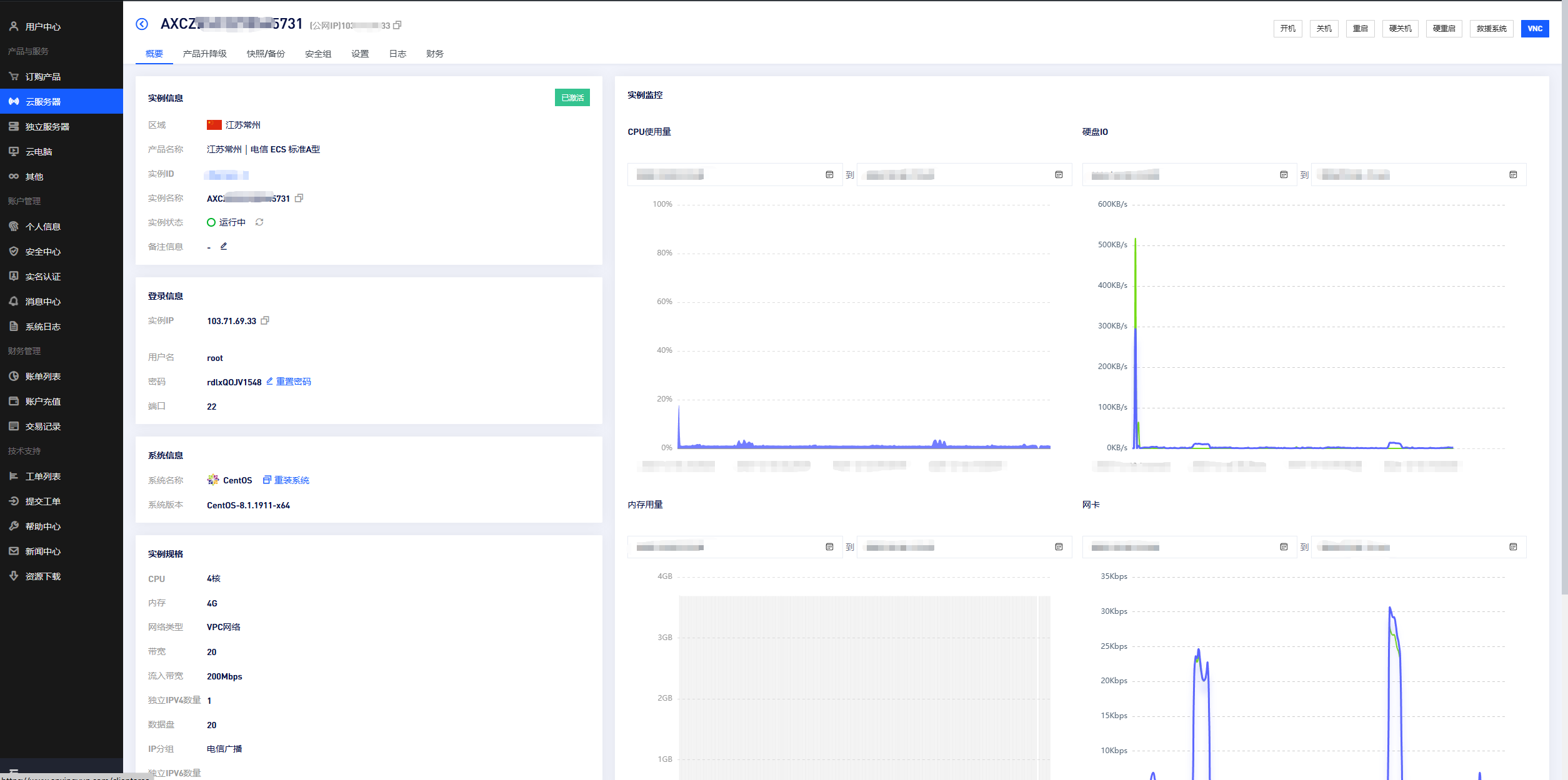 显示实例相关信息,实时展示实例的核心运行指标,包括CPU、内存、磁盘IO和网络带宽的使用情况,帮助您快速掌握服务器健康状态。