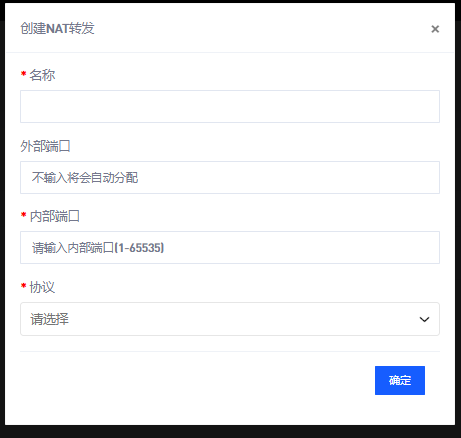在NAT转发管理页面,会看到一个“创建”按钮,如提供的图一所示,点击该按钮,弹出创建NAT转发的窗口,如图二所示。